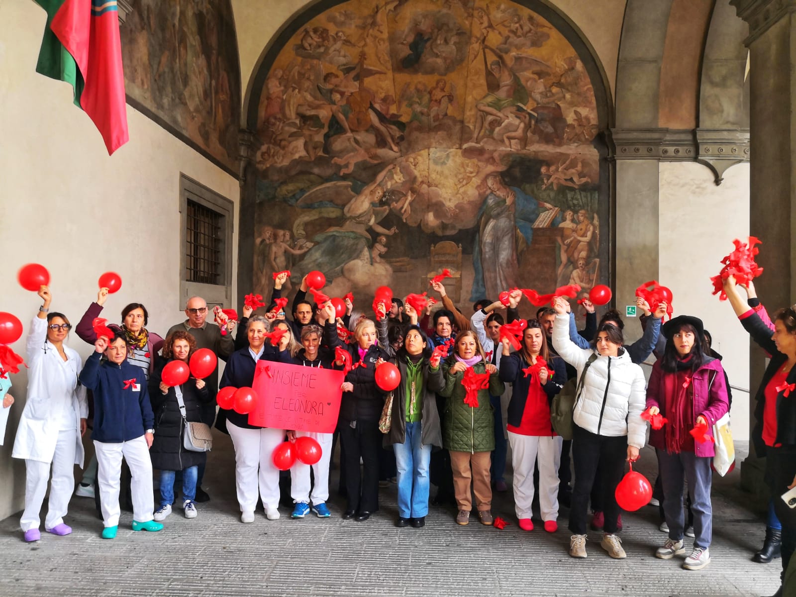 In Santa Maria Nuova due minuti di silenzio sotto il loggiato dell’ospedale durante il quale gli operatori hanno sventolato drappi rossi. Poi il gruppo si è spostato nel cortile delle medicherie per una lettura in ricordo di Eleonora. Mentre la mattina all’interno di Santa Maria Nuova (ma anche al San Giovanni di Dio) si sono tenuti colloqui psicologici gratuiti informativi sul tema della violenza sulle donne e un punto ascolto rivolto sia alle lavoratrici dell’ospedale che alla cittadinanza, per dare informazioni sul percorso del Codice Rosa.