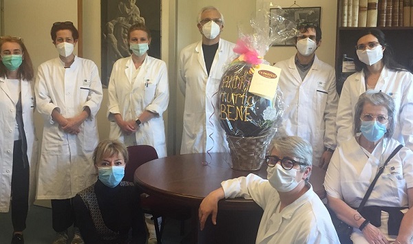 da parte di una pasticceria di San Casciano. L’uovo riporta scritto su un lato “Andrà tutto bene!” e la scritta è accompagnata dall’immancabile arcobaleno, simbolo di forza e speranza per sconfiggere la paura di questi giorni di emergenza. La direzione dell’ospedale si è riunita intorno all’uovo di Pasqua per una foto di ringraziamento alla pasticceria sancascianese.