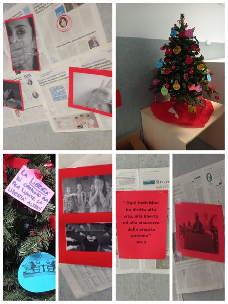 - direzione sanitaria. trasversalità dei messaggi su tutti i tipi di violenza. L’albero è stato costruito con i coperchi di alcune scatole di cartone e sorregge foto con immagini di denuncia e di speranza ottenendo un impatto visivo forte che comunica solidità, stabilità e accoglienza.