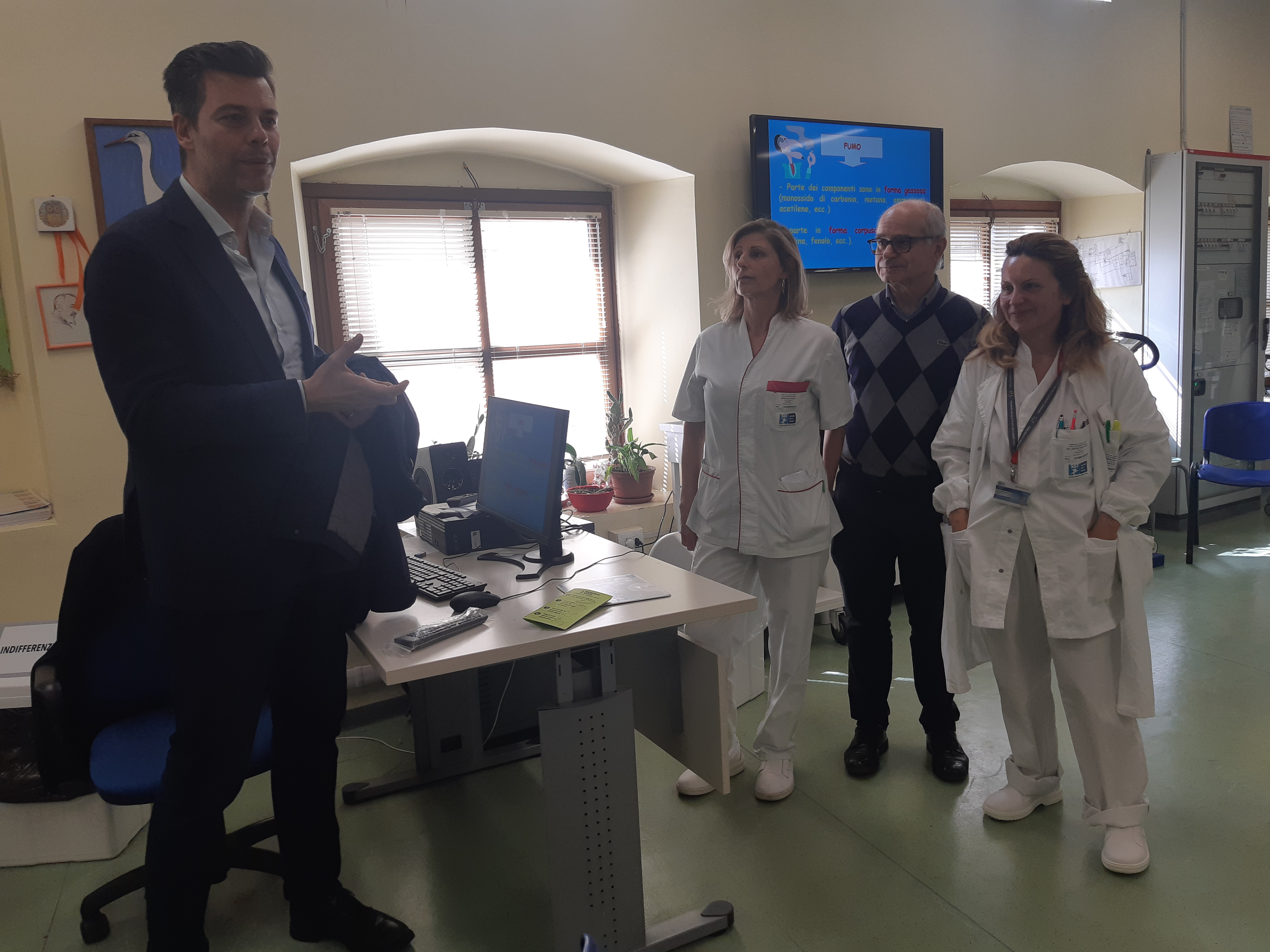 A seguire la direzione aziendale si è recata nella palestra della dov’è presente la Riabilitazione Cardiologica, diretta dal dottor Duccio Rossini: qui sono effettuati interventi riabilitativi su pazienti che hanno subito eventi cardiologici acuti (come per esempio l’infarto), interventi di cardiochirurgia, e su pazienti affetti da scompenso cardiaco. La struttura è a valenza aziendale. E’ stato inoltre consolidato l'Ambulatorio follow up per i pazienti dimessi dalla cardiologia che vengono seguiti ad un mese dalla dimissione.