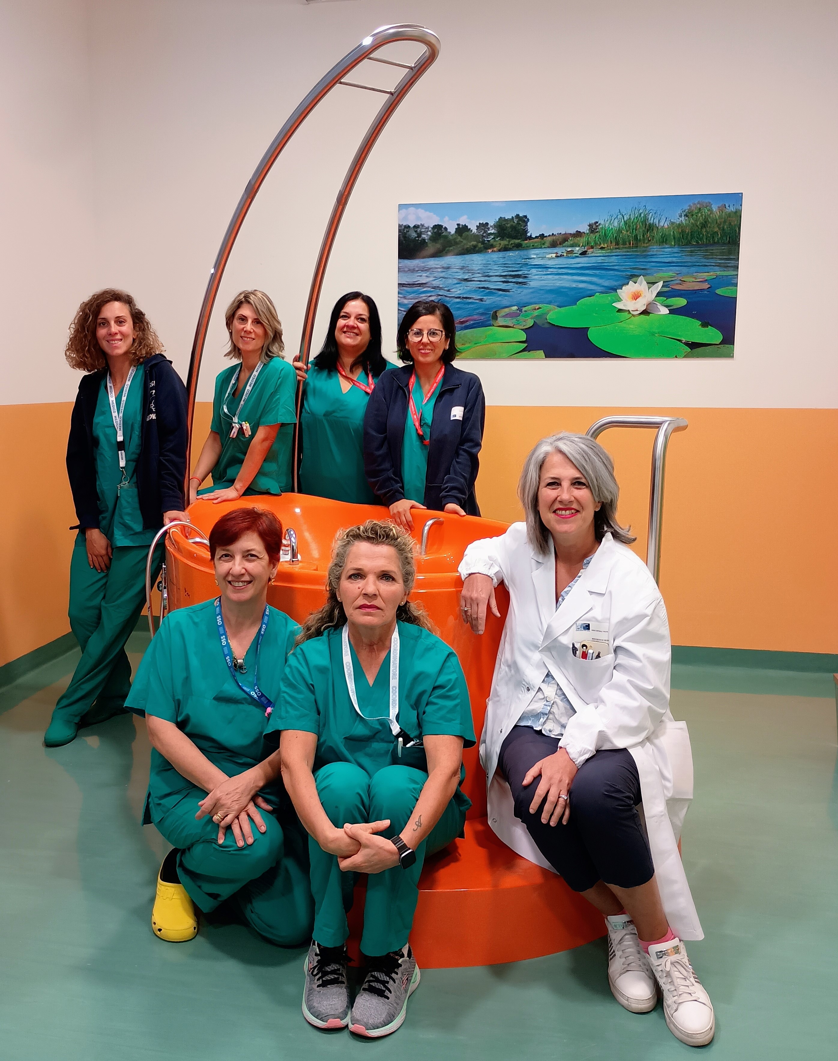 nella foto allegata la dott.ssa Scatena con il personale ostetrico e la coordinatrice Cipriani nella stanza del travaglio/parto in acqua