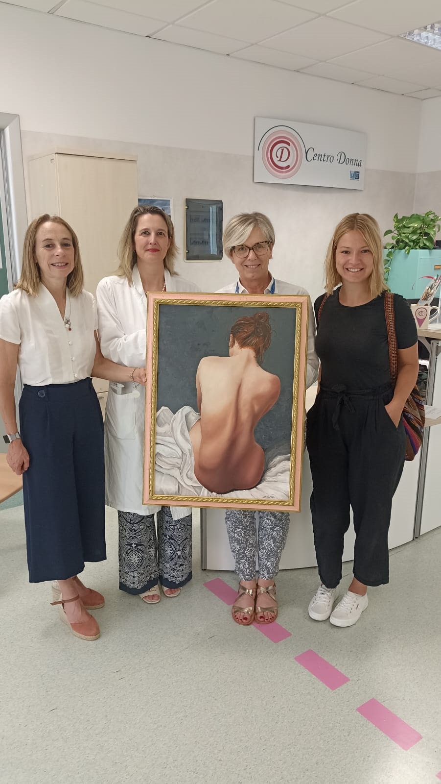 In foto il quadro donato. Da sinistra dott.sse Bellini, Martella e Meini con la pittrice